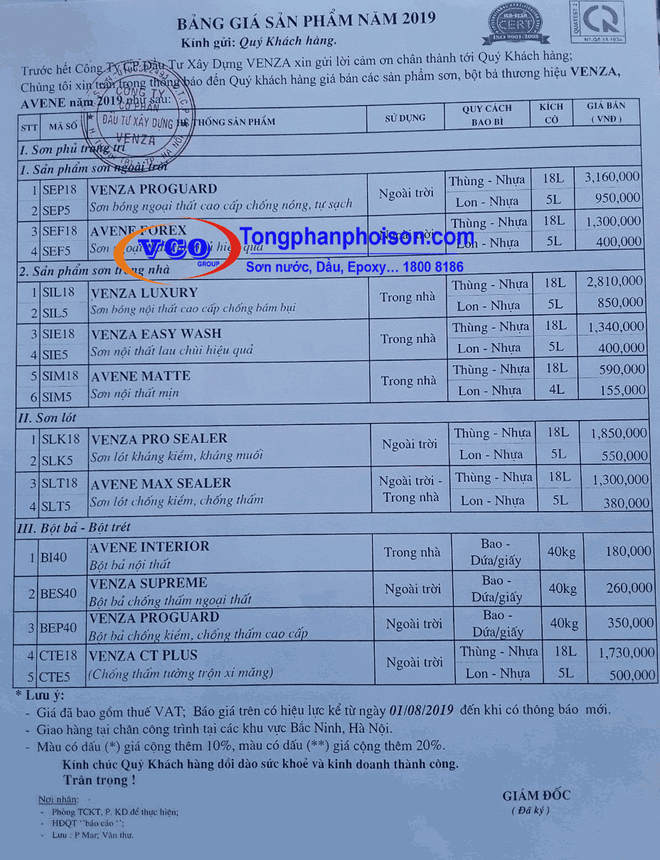 - Quý khách hàng lưu ý bảng báo giá sơn và chương trình chiết khấu % sẽ được áp dụng trên toàn quốc và sẽ được cập nhật khi có bảng báo giá mới từ phía nhà sản xuất.