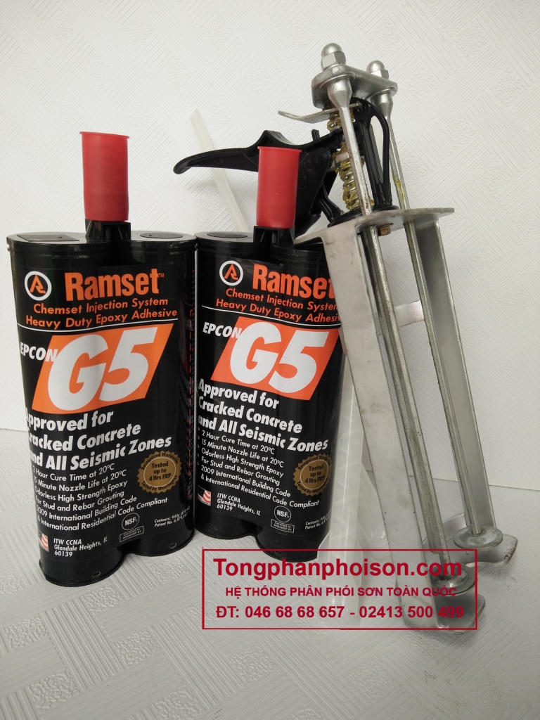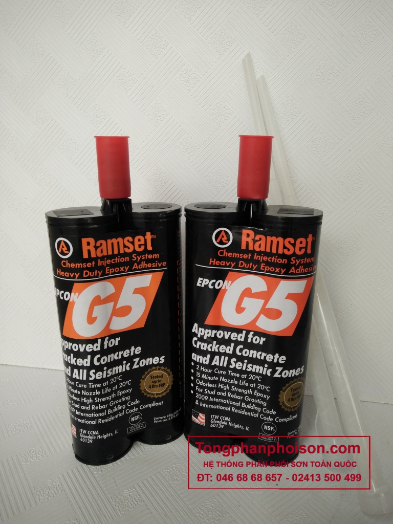 Ramset Epcon G5 là loại keo Epoxy hai thành phần cường độ cao được sản xuất tại Mỹ, đáp ứng nhu cầu liên kết thép và thanh ren vào bê tông. Sản phẩm được đóng gói trong hai bình nhựa cứng với dung tích 650ml rất an toàn không bị thủng, rách khi vận chuyển cũng như sử dụng trong công trường.